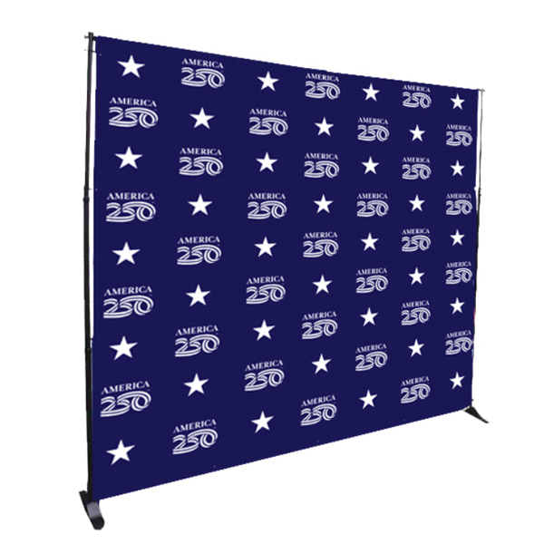 The America250™ Adjustable Backdrop is a versatile, freestanding display solution ideal for ceremonies, media moments, photo opportunities, presentations, and event activations tied to America250™ celebrations. Designed with telescoping metal poles, the adjustable frame allows a single stand to accommodate backdrops of varying sizes providing flexibility for different venues and layouts without the need for multiple display systems.